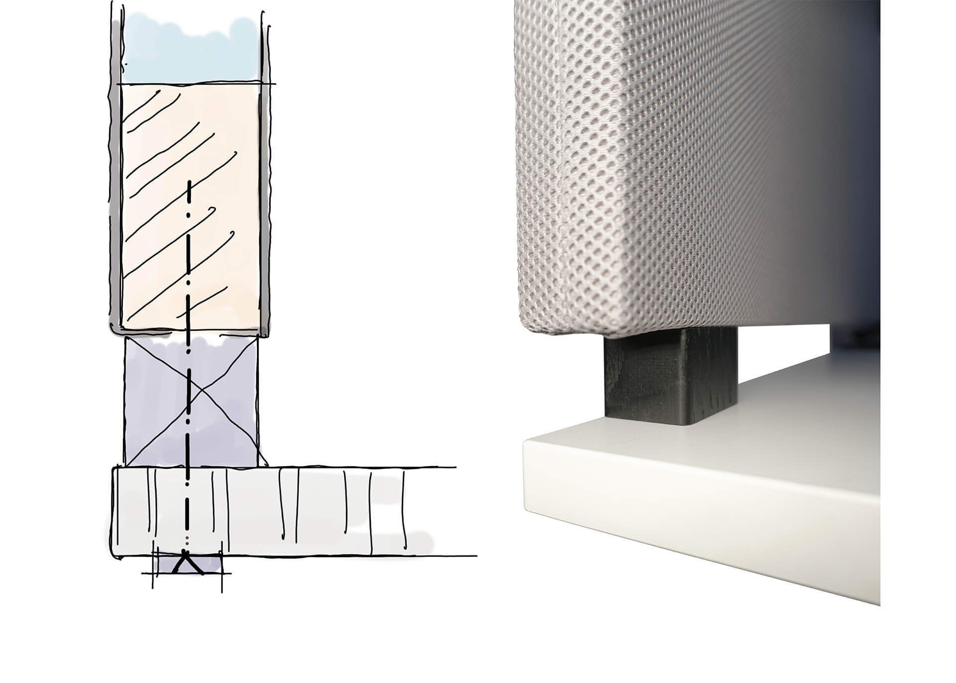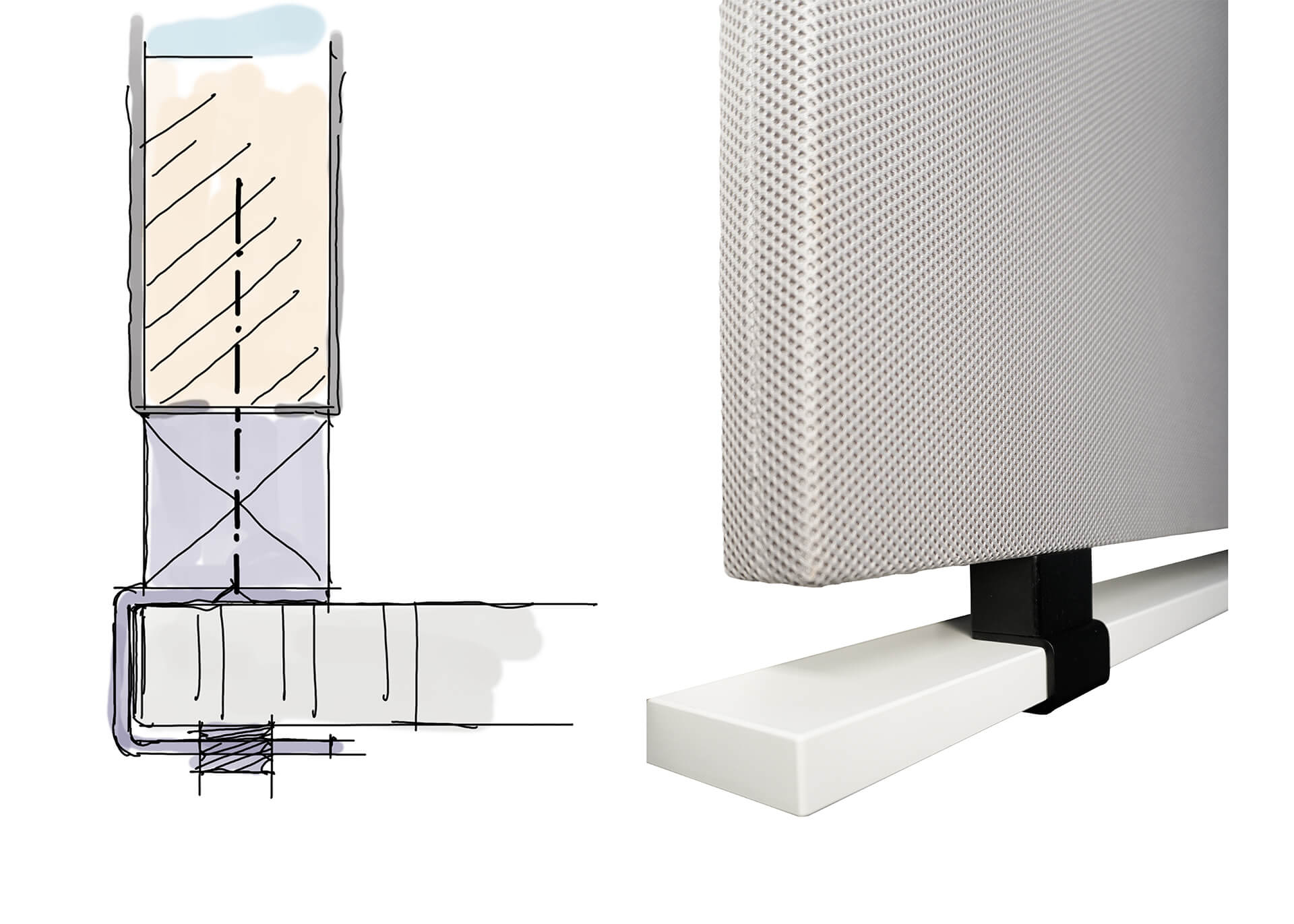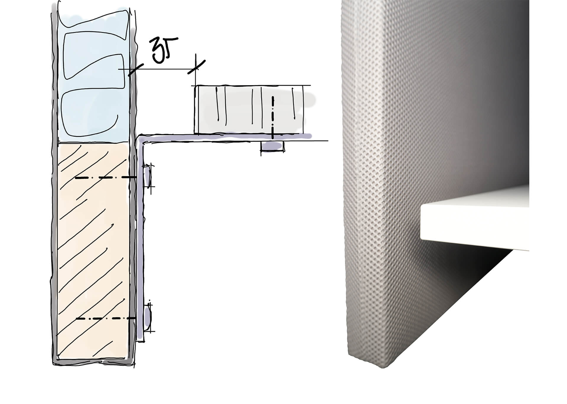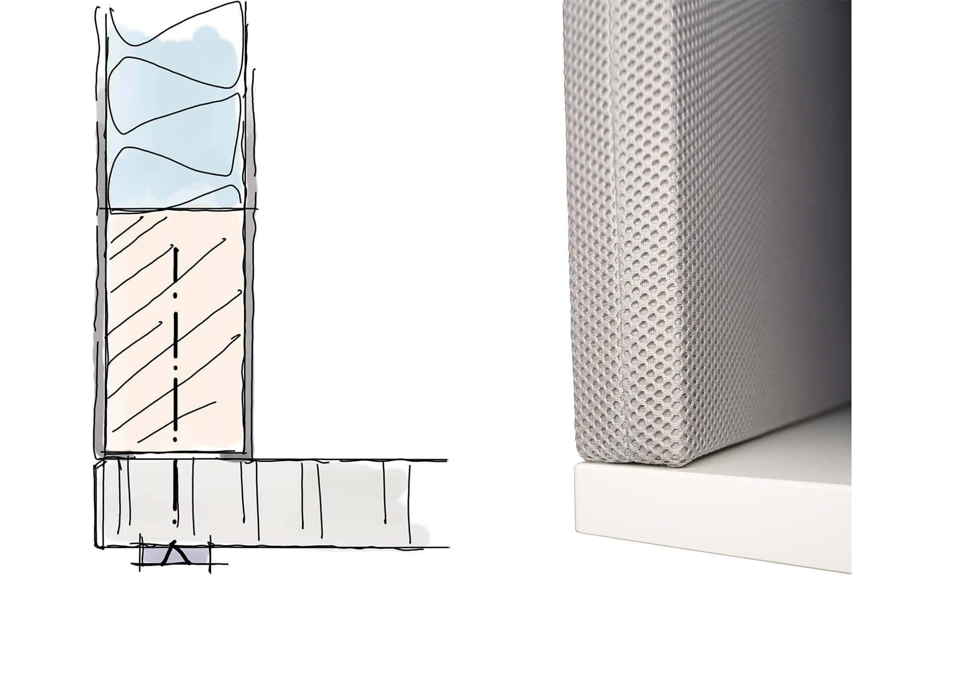 einem Akustikstoff überzogen ist. Die oberen Ecken der Trennwand sind für eine