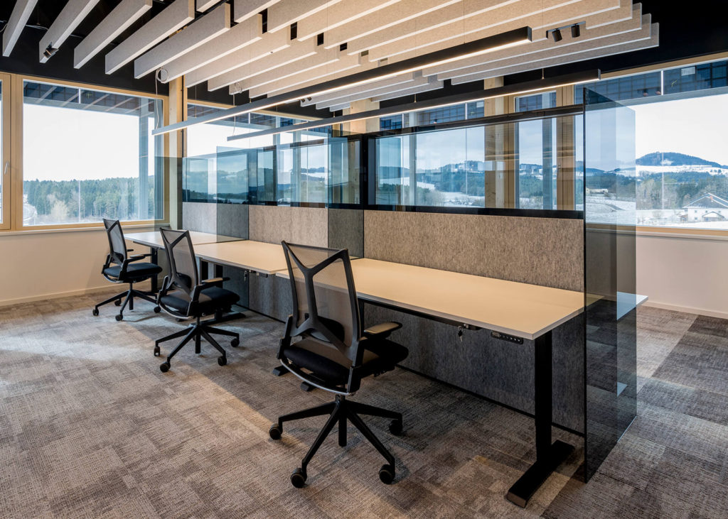 Die einfach zu montierenden Akustikelemente fügen sich nahtlos in die Büroarchitektur ein und schaffen angenehme Arbeitsbedingungen für konzentriertes Arbeiten.